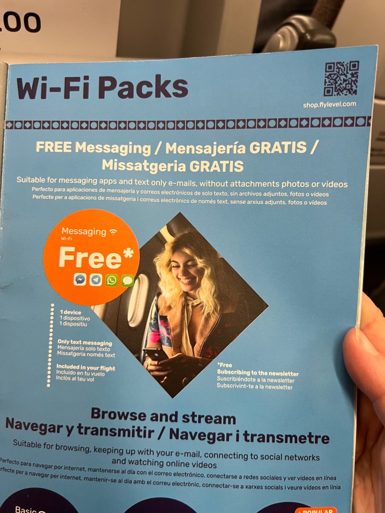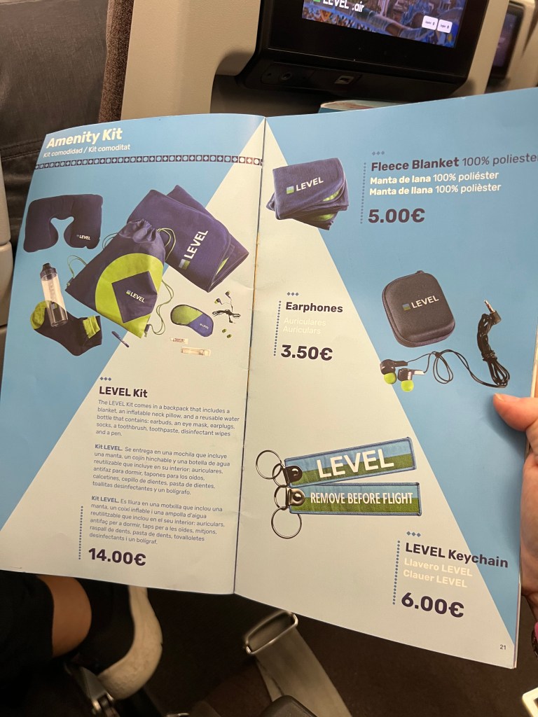 The best FREE perk of LEVEL, they offer free WIFI for messaging only during the entire flight!!!!! *Wifi was not working for flight leg 6, which made for an extra long 10 hour day flight:(